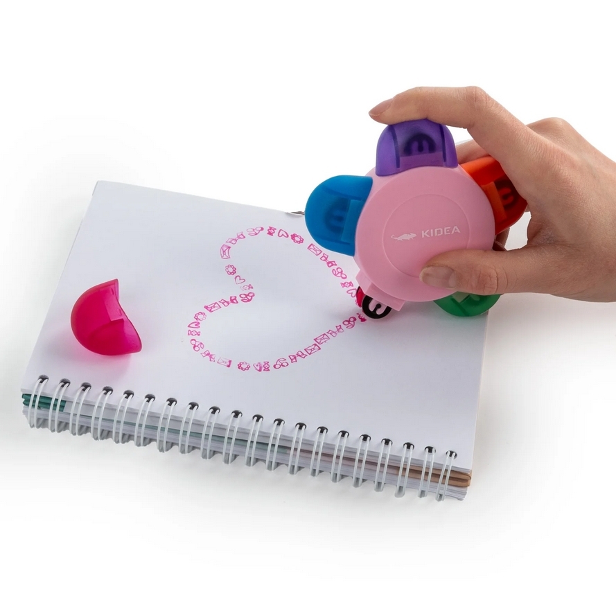 Dodaj magii swoim projektom dzięki samotuszującemu rollerowi dekoracyjnemu w kształcie kwiatka. Każdy kolor posiada unikatowy wzór, dzięki czemu możesz tworzyć kreatywne, efektowne ozdoby na kartkach, zaproszeniach i projektach DIY. Fioletowy kolor z motywem magicznym – motylki, tęcza, jednorożce, babeczki, gwiazdki i zamek. Niebieski z motywem wakacyjno-hobbistycznym – muzyka, lody, podróze, kotki, fotografia. Różowy w motywie słodko-miłosnym – kwatki, kokardki, cukierki i wiśnie. Zielony w stylu wiosennym – ptaszki, truskawki parasol, grzybki, żaby i koniczynki. Pomarańczowy z motywem letnim – słońce, lody, muszelki, lew, miś oraz księżyc i gwiazdy.