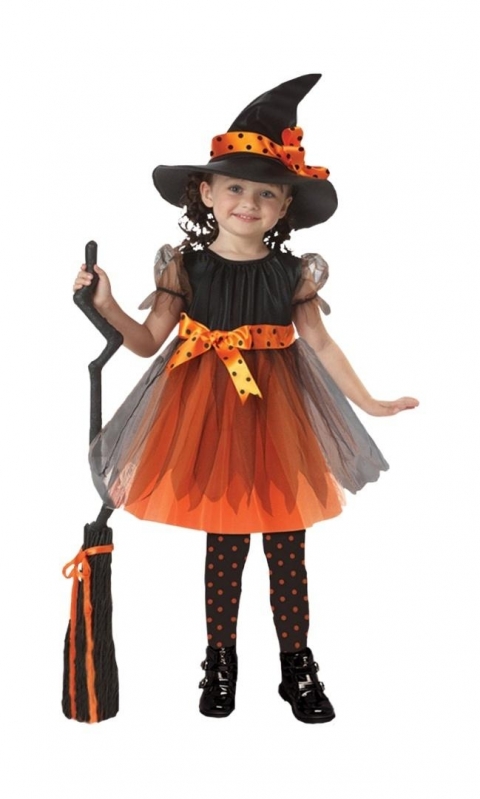 Przebranie dla dziewczynki w kolorach pomarańczowym oraz czarnym. Strój składa się z sukienki z krótkimi rękawami, z tiulowym wykończeniem oraz kapelusza czarownicy. Posiada ozdobne kokardy.