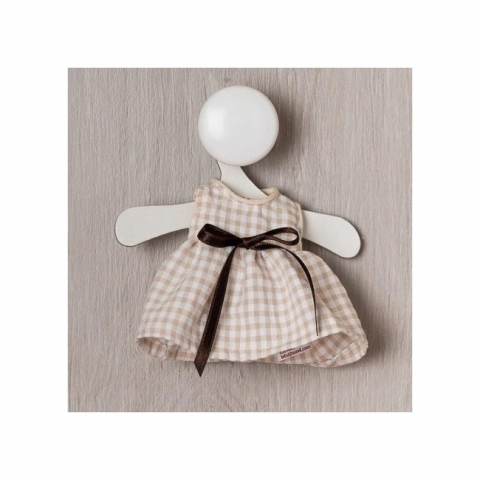 Ręcznie szyta, miękka, bawełniana sukienka w beżową krateczkę została zaprojektowana specjalnie dla lalek hiszpańskich z serii ASI Bomboncin. Kreację zdobi satynowa lśniąca kokardka. Wygodne zapięcie na rzep umożliwia łatwe zdjęcie i nałożenie ubranka. Outfit na kartonowym wieszaczku z logo marki ASI zapakowany jest w foliowe opakowanie. Wszystkie ubranka dla lalek marki ASI są w całości szyte w Hiszpanii.