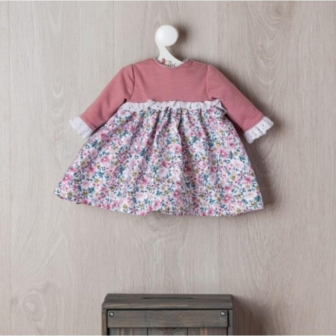 Luksusowy projekt stroju dla lalki hiszpańskiej o wysokości około 57 cm wyróżnia się modną kolorystyką i oryginalnym zestawieniem wysokiej jakości tkanin. Ręcznie szyta sukienka z długim rękawem została wykonana z pudrowo-różowego, gładkiego materiału oraz białej tkaniny w kolorowe wzory kwiatowe. Zwraca uwagę eleganckie wykończenie za pomocą białej gipiury. Sukienkę, dzięki zastosowaniu rzepa z tyłu, można z łatwością zakładać i zdejmować. Idealnie pasuje na lalki hiszpańskie z linii ASI Pepa.
