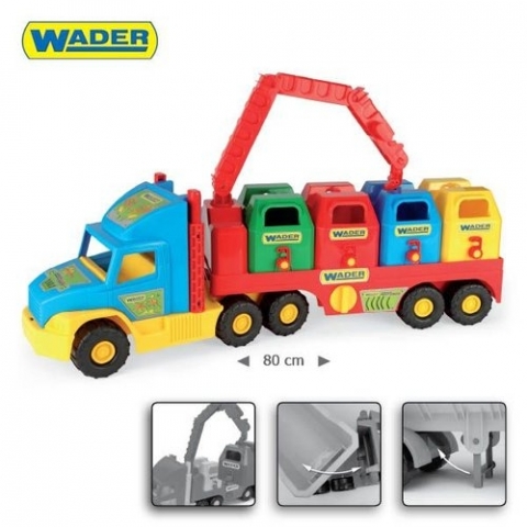 Super Truck śmieciarka to duże, 77 centymetrowe auto ze znanej i cenionej serii Super Truck. W skład zestawu wchodzą 4 kontenery na śmieci z otwieranym spodem oraz dźwig, który ma możliwość ściągania ich z ruchomej naczepy. Dużą zaletą produktu jest lekkość konstrukcji i realistyczny wygląd. Zestaw jest bezpieczny dla najmłodszych, odznacza się dużą wytrzymałością, pobudza wyobraźnię dzieci i rozwija zdolności manualne. Całość wykonana jest z wysokiej jakości tworzywa sztucznego, odpornego na warunki atmosferyczne, dzięki czemu zabawkę przez cały rok można przechowywać np. w ogródku czy na balkonie.