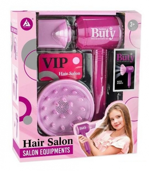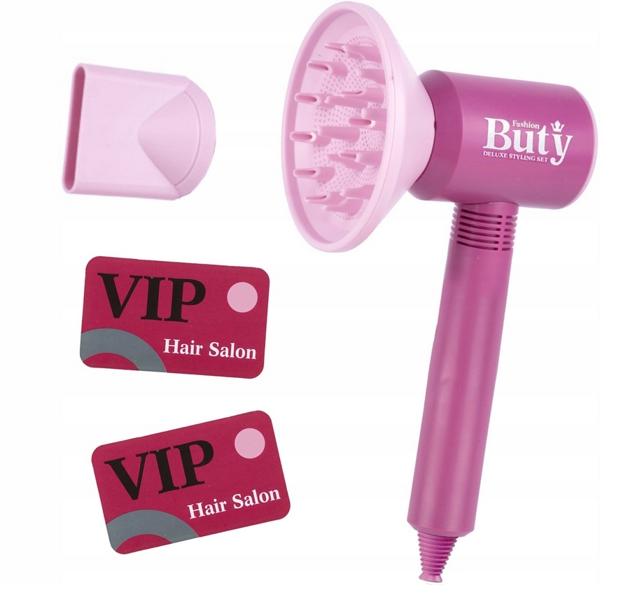 Ta różowa zabawkowa suszarka z efektami dźwiękowymi to strzał w dziesiątkę! W zestawie znajdziesz takie elementy jak: dyfuzor i wąską końcówkę, które pozwolą na tworzenie niezwykłych fryzur.