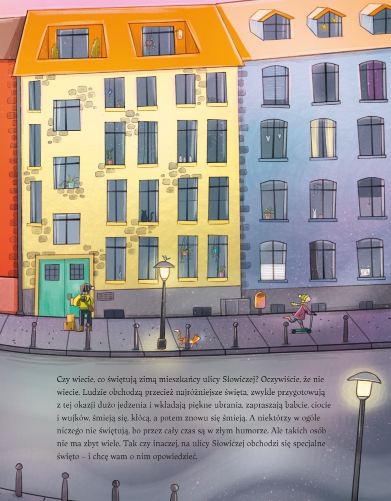 Okazuje się, że tego dnia można obchodzić tyle różnych świąt – i sami możemy zdecydować, jakie to będą święta. A gdy na dworze zaczyna padać pierwszy tej zimy śnieg, sąsiedzi wychodzą z domów i na ulicy Słowiczej robi się magicznie, gwarnie i miło. Bo święto pierwszego śniegu mogą obchodzić wszyscy! Ciepła i prześlicznie zilustrowana książka, która uczy empatii i szacunku. Zapoznaje też dzieci ze świętami obchodzonymi przez wyznawców różnych religii. I pokazuje, że każdy ma prawo świętować po swojemu.