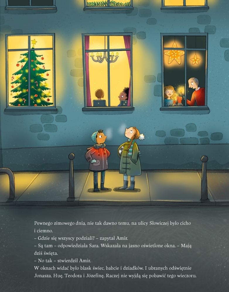 Sara i Amir z ulicy Słowiczej nie mają się z kim bawić. Inne dzieci zostały w domach – przez okna widać, że świętują. U Sary i Amira obchodzi się inne święta. Na dodatek ich rodzice są dziś w pracy. Zapowiada się nudny wieczór. Dzieci postanawiają więc pograć w piłkę, ale jak pech, to pech: piłka wpada im do ogródka zrzędliwego sąsiada! Choć trochę się boją, zaglądają do domu starszego pana, a wtedy…