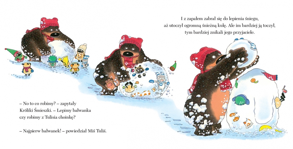 Miś Tuliś, zachwycony i przejęty nadchodzącą Wigilią, wybiega na poszukiwanie idealnej choinki. Tuliś nie spodziewa się, że spotka go tyle niezwykłych przygód i że znajdzie baśniowego przyjaciela! Ma tyle przytuleń do podarowania, że kilka rozdał drzewom, ale ciągle mu mało. Aż tu „pac”, nadlatują śnieżki i nadbiegają jego przyjaciele i zaczynają się wspaniałe zimowe zabawy. A na koniec Miś jak zwykle da dobre rady i pokaże, co robić w czasie świąt Bożego Narodzenia i w każdy dzień adwentu.