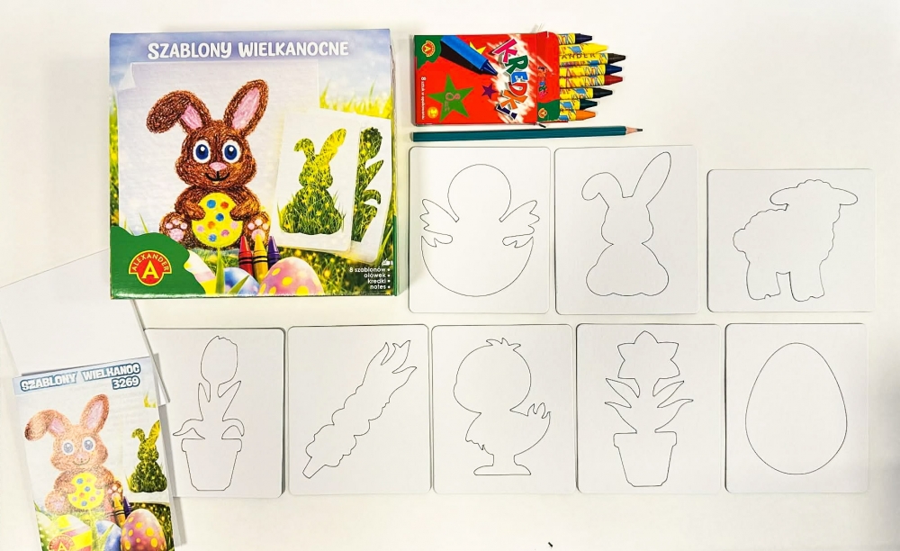 Ten zestaw kreatywny na Wielkanoc zawiera 8 tematycznych wzorów (w pozytywie i negatywie), dzięki którym dziecko z łatwością odwzoruje najbardziej rozpoznawalne symbole świąt: