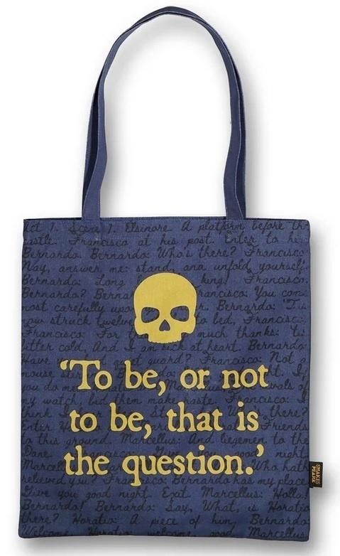 Na granatowym tle torby widnieje złoty napis "To be, or not to be, that is the question."oraz prosty symbol czaszki - klasyczne odniesienie do jednej z najbardziej znanych kwestii w literaturze dramatu, cytowanej przez Hamleta .