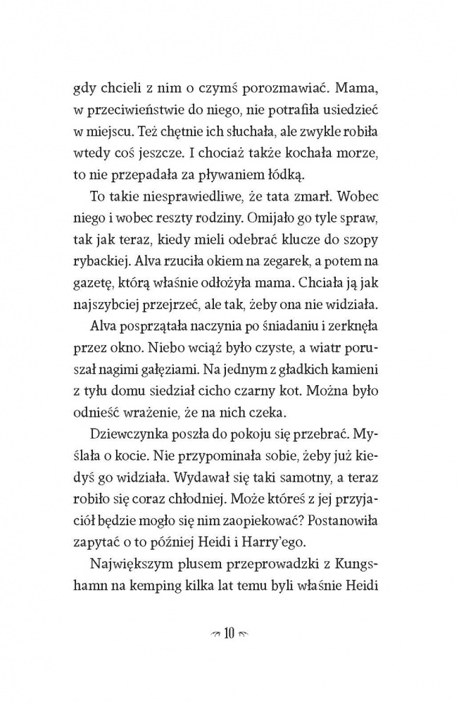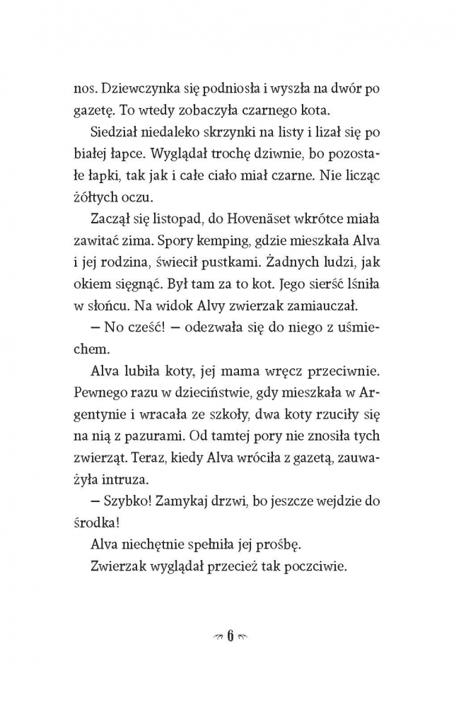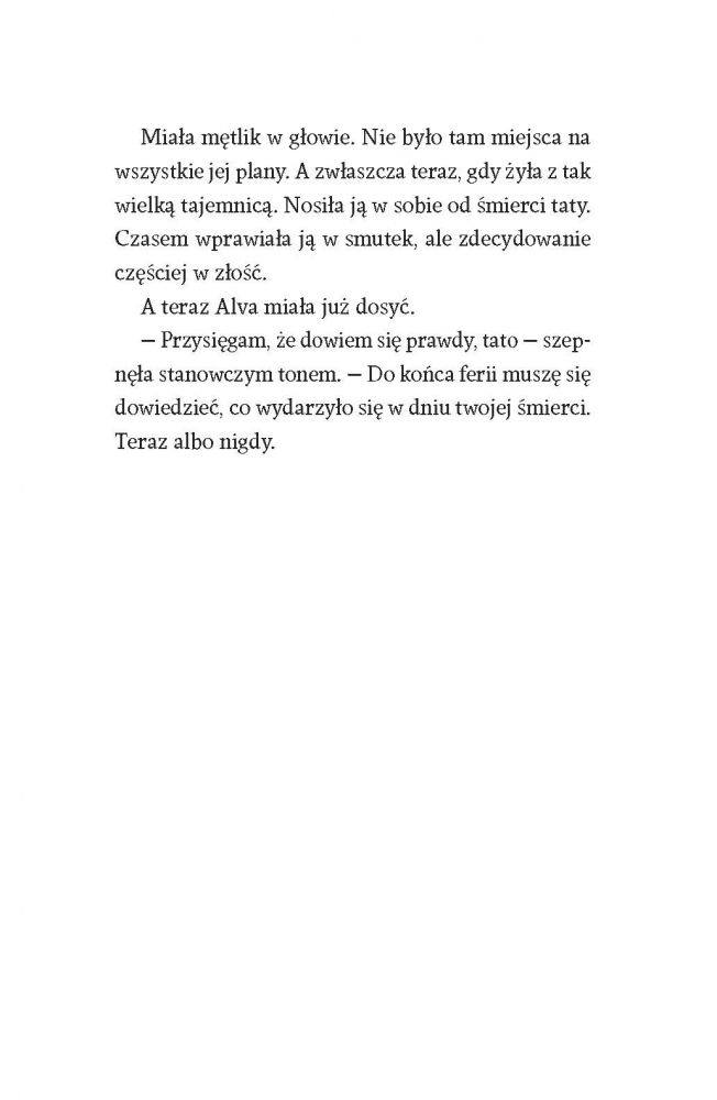 Zagadki się mnożą. Alva wszędzie widzi kota, a nocami słyszy niepokojące dźwięki. Wydaje jej się, że za drzwiami swojego pokoju słyszy kroki taty, ale on przecież od kilku lat nie żyje. Wkrótce Alva dowiaduje się, że jest w niebezpieczeństwie. Niektóre tajemnice po prostu powinno się zostawić w spokoju...