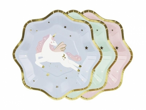 Talerzyki papierowe Jednorożec, mix kolorów, wymiary ok. 18 x 18 cm(1 op. / 6 szt.)