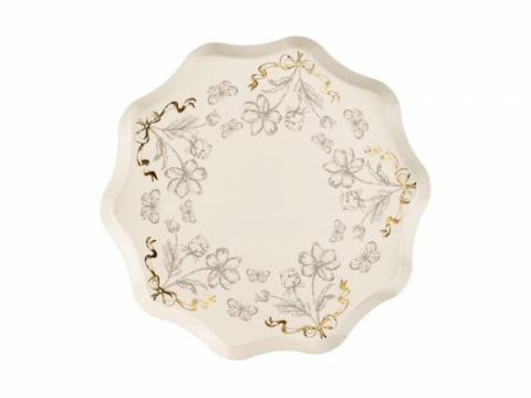 Papierowe, beżowe talerzyki z ciemnobeżowymi kwiatami i złotym błyszczącym nadrukiem. Średnica około 20 cm.(1 op. / 6 szt.)