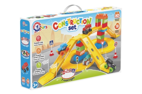Zabawka składa się z 80 różnych elementów, w tym: części toru z rozjazdami i zakrętami, pochyłości, znaków drogowych oraz samochodów. Klocki konstrukcyjne są wygodne i łatwe do łączenia. Dzieci samodzielnie wybierają kształt drogi, ponieważ zestaw zawiera różnorodne elementy, jak klasyczny zestaw konstrukcyjny. W komplecie znajduje się także 7 znaków drogowych, które wspomagają rozwój pamięci, koncentracji i spostrzegawczości u młodych miłośników motoryzacji.