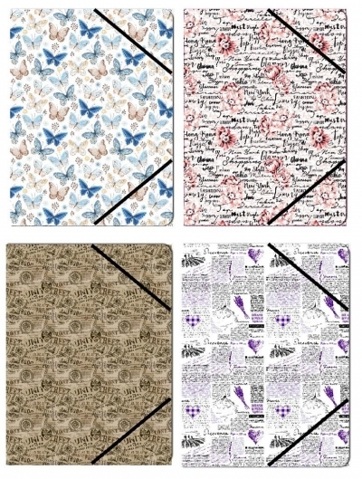 Ozdobna teczka na dokumenty formatu A5, zamykana na gumkę. Dostępna w czterech wzorach.