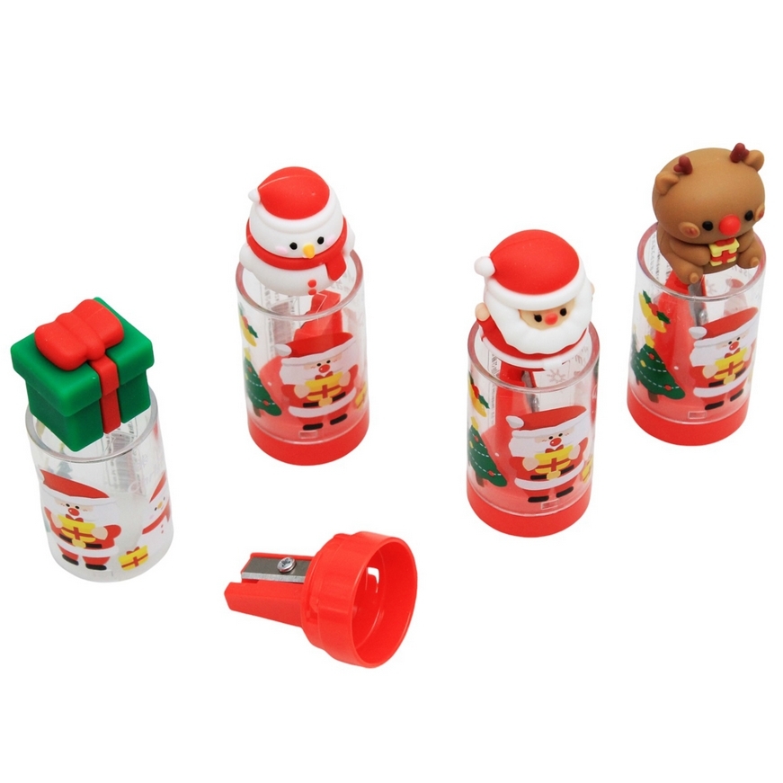 - Pojedyncza temperówka z pojemnikiem w kształcie Św. Mikołaja, renifera, bałwana lub prezentu