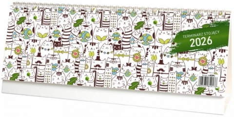 Terminarz stojący na biurko z kalendarium w układzie tygodniowym poziomym. W dolnej części kalendarium skrócone kalendarium trzech miesięcy. W kalendarzu zaznaczone święta i daty imienin.