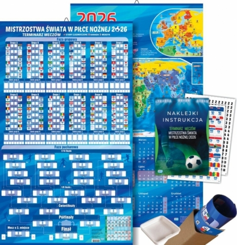 Na jednej stronie znajduje się przejrzysty terminarz meczów MŚ 2026 z miejscem do uzupełniania wyników oraz oznaczania drużyn awansujących do kolejnych etapów turnieju przy użyciu naklejek z dołączonej książeczki. Na odwrocie umieszczono praktyczny kalendarz na rok 2026 oraz mapę świata z zaznaczonymi konfederacjami piłkarskimi. Zestaw uwzględnia również etap barażowy w zakresie informacyjnym.