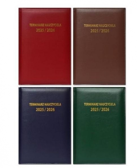 OKŁADKA: miękka, skóropodobna z gąbką 3mm i obszyciem, złocenie "Terminarz Nauczyciela 2025/2026"