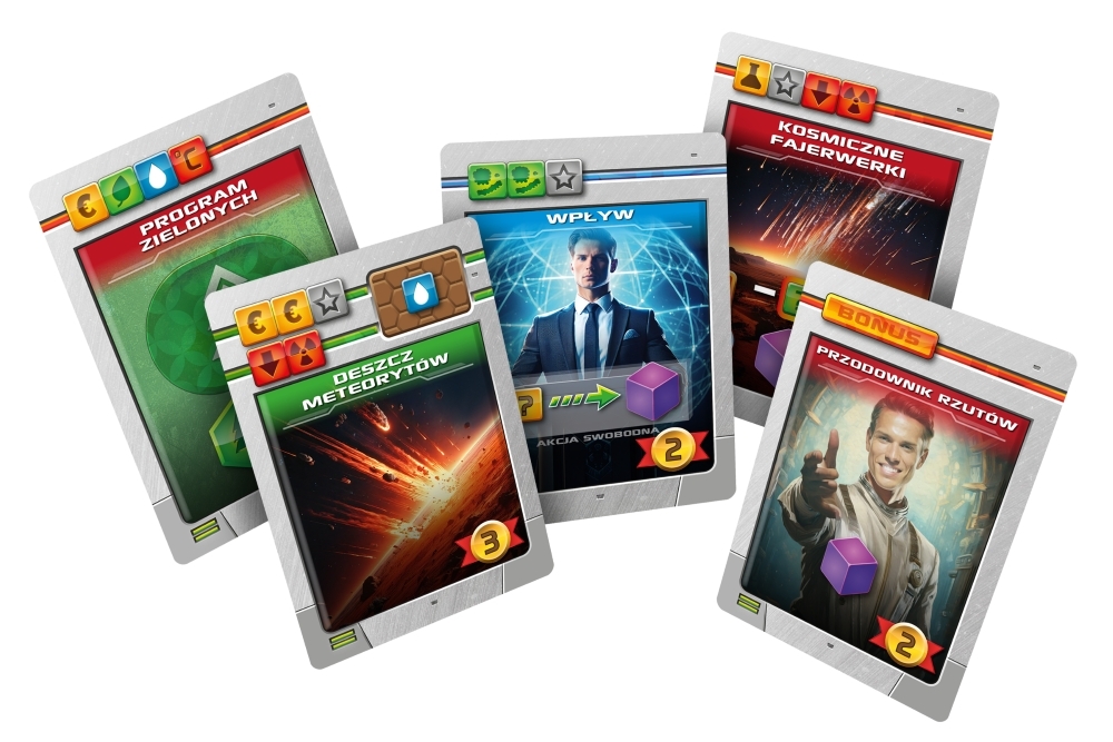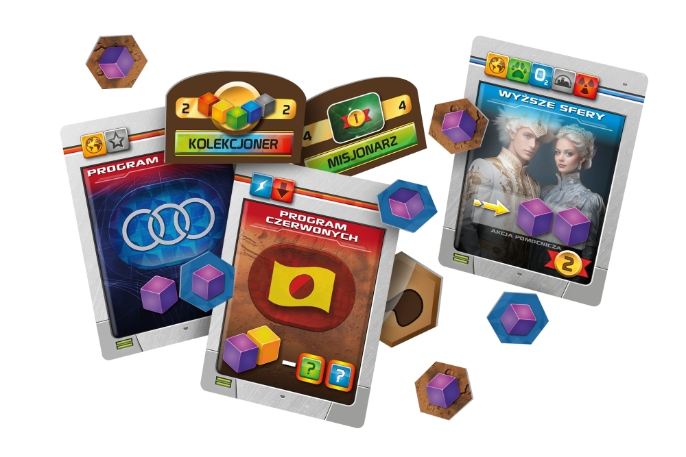 Oprócz mechaniki misji, rozszerzenie wprowadza też nowe tytuły, projekty i korporacje, a także fioletowe kości, które reprezentują wpływy graczy i mogą zapewnić im bonusy w postaci kart, znaczników uniwersalnych oraz punktów. Dzięki nim rozgrywki będą jeszcze bardziej taktyczne!