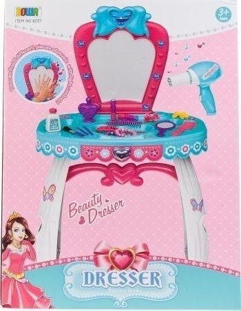 Piękna toaletka MEGA CREATIVE w dziecięcym wydaniu, zawiera mnóstwo dodatków które z pewnością ucieszą każdą młodą damę. Każda księżniczka marzy by być piękną już od samego rana! Toaletka zawiera funkcje multimedialne-serce w lusterku świeci się. Szuflada przy toaletce jest wysuwana więc można w niej schować drobiazgi. Zestaw zawiera: toaletkę z funkcjami dźwiękowymi oraz świetlnymi, suszarkę do włosów, grzebień, lusterko, dwie kokardy na włosy, dwie bransoletki, flakonik z perfumami, naszyjnik oraz zestaw pędzelków do makijażu. Suszarka po uruchomieniu wydaje odgłos jak prawdziwa suszarka. Całość wykonana jest z plastiku. Zestaw przeznaczony dla dzieci w wieku: 3+. Wymaga zasilania bateriami 4 x AALR6-nie załączono do zestawu.