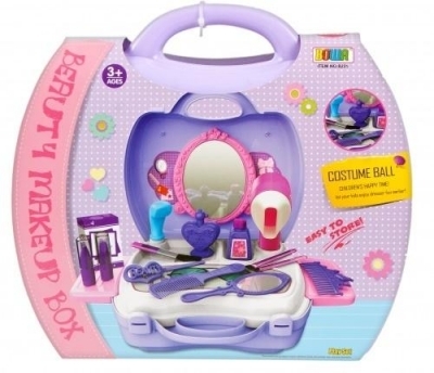 Toaletka posiada lustro, suszarkę do włosów, grzebienie, spinki do włosów oraz wiele innych akcesoriów potrzebnych do wykonania porannej toalety. Zestaw zapakowany jest w wygodną i podręczna walizkę dzięki czemu można ją zabrać ze sobą wszędzie. Posiada 21 elementów. Produkt wykonany z plastiku. Przeznaczony dla dzieci od lat 3