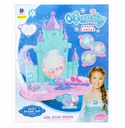Piękna toaletka MEGA CREATIVE w kształcie Zamku, zawiera mnóstwo dodatków, które z pewnością ucieszą każdą młodą damę. Każda księżniczka marzy, by być piękną już od samego rana! Toaletka zawiera funkcje multimedialne - lusterko świeci się w trzech kolorach niebieskim, różowym oraz czerwonym. Zestaw zawiera: toaletkę z funkcjami dźwiękowymi oraz świetlnymi, suszarkę do włosów, 3 lakiery do paznokci, różdżkę, 2 bransoletki, grzebień do włosów, 2 szminki, 3 pierścionki oraz spinki do włosów. Całość wykonana jest z plastiku. Zestaw przeznaczony dla dzieci od lat: 3+. Wymaga zasilania bateriami: 3 x AA/LR6-nie załączono do zestawu.