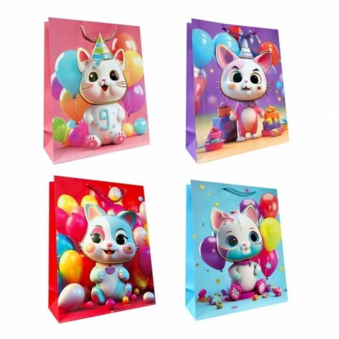 Torebka papierowa dziecięca z wizerunkiem kolorowego urodzinowego kotka wykonana z grubszego papieru o gramaturze 210 g, co zapewnia jej większą trwałość i odporność na obciążenie. Wyposażona w grubszy, kolorowy sznurek, który zapewnia wygodny uchwyt i estetyczne wykończenie. To praktyczne opakowanie, które podkreśla wartość wręczanego prezentu. Torebka posiada elementy metalizowane oraz 3D.
