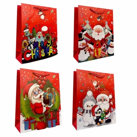 Świąteczna torebka prezentowa wykonana z trwałego papieru, utrzymana w klasycznej, eleganckiej stylistyce. Idealna do zapakowania prezentów pod choinkę, nadaje upominkom wyjątkowy, odświętny charakter. Wyposażona w mocne uchwyty i staranne wykończenie, łączy estetykę z praktycznością.