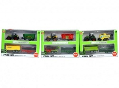 W zestawie znajduje się traktor metalowy oraz trzy różne przyczepy do maszyn rolniczych. Przyczepy można wymieniać dowolnie w zależności od potrzeby. Zabawka wykonana z plastiku i metalu.