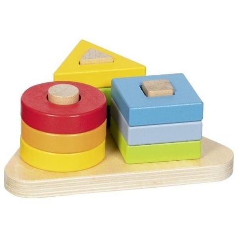 Drewniany sorter z 9 kolorowymi trójkątami do dopasowania. Maluchy uczą się rozpoznawania kolorów i kształtów, ćwicząc motorykę i logiczne myślenie. Zabawa rozwija zdolność dopasowywania elementów i precyzję ruchów.