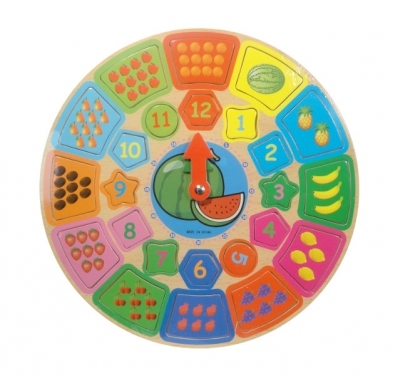 Drewniany zegar edukacyjny – owoce i cyfry. Kolorowa układanka w formie zegara z ruchomą wskazówką oraz wyjmowanymi elementami z cyframi od 1 do 12 i ilustracjami owoców. Zabawka wspiera naukę liczb, rozpoznawanie kolorów oraz ćwiczy koordynację ręka-oko i sprawność manualną. Produkt zapakowany w przezroczystą folię.