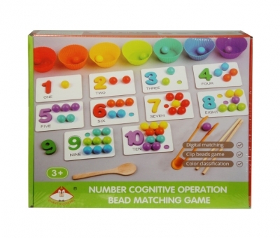 Gra edukacyjna do nauki liczb i kolorów. Zestaw zawiera karty, kolorowe kulki, szczypce i miseczki. Zabawka przeznaczona dla dzieci od lat 3. Produkt zapakowany w kartonowe pudełko. Podane wymiary są wymiarami opakowania.