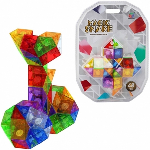 Magiczny Wąż "Magic Snake" (48 Elementów) - Rozszerzone Możliwości Kreatywnego Układania! Przedstawiamy zaawansowaną wersję klasycznej układanki logicznej - "Magic Snake" od DIAN SHENG TOYS, teraz z imponującymi 48 elementami! Ta układanka przenosi kreatywną zabawę na wyższy poziom, oferując jeszcze więcej swobody w tworzeniu skomplikowanych i fascynujących kształtów dzięki przezroczystym, kolorowym segmentom. Cechy produktu: Rozszerzona Klasyka: To większa i bardziej złożona wersja popularnego "Węża Rubika", składająca się z aż 48 połączonych ze sobą trójkątnych segmentów (jak widać na opakowaniu "48 PCS"). Większa liczba elementów oznacza nieskończone możliwości tworzenia imponujących figur i rzeźb. Przezroczyste, Żywe Kolory: Segmenty wykonane są z wysokiej jakości, przezroczystego tworzywa sztucznego w intensywnych barwach (fioletowy, pomarańczowy, zielony, niebieski, czerwony, żółty). Ich przejrzystość dodaje ukadance nowoczesnego wyglądu i dynamicznego efektu wizualnego, gdy światło przez nie przechodzi. Nieograniczone Możliwości Tworzenia: Obracaj i składaj segmenty, aby tworzyć zwierzęta, obiekty, skomplikowane figury geometryczne, abstrakcyjne formy i wszystko, co tylko podpowie wyobraźnia. To idealna zabawka do eksperymentowania z przestrzenią i kształtem. Rozwój Kluczowych Umiejętności: Układanka znakomicie rozwija wyobraźnię przestrzenną, logiczne myślenie, kreatywność, a także zdolności manualne i motorykę małą. Jest to doskonałe narzędzie do ćwiczenia koncentracji, cierpliwości i umiejętności rozwiązywania problemów w przyjemny sposób. Wysoka Jakość Wykonania: Produkt firmy DIAN SHENG TOYS, znanej z precyzji w produkcji łamigłówek, gwarantuje płynne i satysfakcjonujące obracanie każdego segmentu oraz długotrwałą wytrzymałość. Kompaktowy i Przenośny: Pomimo większej liczby elementów, układanka jest nadal poręczna i łatwa do zabrania w podróż, zapewniając rozrywkę w dowolnym miejscu - w domu, w podróży, czy podczas oczekiwania. Atrakcyjne Opakowanie: Zabawka jest zapakowana w estetyczny blister, który eksponuje jej kolorowe i przezroczyste segmenty, czyniąc ją idealnym pomysłem na prezent. Wielkość opakowania: 25x18x7 cm Idealna dla: Miłośników łamigłówek, puzzli i gier logicznych w każdym wieku. Osób poszukujących kreatywnej i rozwijającej zabawki. Prezentu dla fanów klasycznych zabawek w nowym, ulepszonym wydaniu. Rozwijania zdolności manualnych, przestrzennych i cierpliwości. Pozwól sobie lub swojemu dziecku na godziny wciągającej, kreatywnej zabawy z "Magic Snake" (48 elementów) i odkryj nieskończone możliwości formowania!
