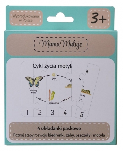 W opakowaniu znajdują się puzzle przedstawiające cykl życia biedronki, motyla, żaby i pszczoły. Podstawą wydania puzzli są ręcznie malowane ilustracje, które są zgodne z rzeczywistym wyglądem zwierząt. Puzzle pomagają poznać etapy rozwoju różnych zwierząt i owadów. Dzięki ciekawej i estetycznej formie dają możliwość nauki i zabawy.