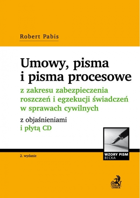 Umowy, pisma i pisma procesowe z zakresu zabezpieczenia i egzekucji świadczeń w sprawach cywilnych z objaśnieniami i płytą CD, to publikacja zawierająca szczegółowe zestawienie wzorów umów, pism i pism procesowych najczęściej występujących zarówno w obrocie cywilnym, jak i postępowaniu cywilnym.Opracowanie zawiera ok. 110 wzorów umów, pism i pism procesowych, obejmujących zarówno procesowe, jak i materialnoprawne pisma tworzone na podstawie przepisów Kodeksu cywilnego oraz Kodeksu postępowania cywilnego. Obok wzoru konkretnego pisma modelowego, z uwzględnieniem jego poprawnej formy i wymagań co do treści, zamieszczono szczegółowy komentarz, w którym wskazano problemy wynikające na tle tworzenia i stosowania konkretnych pism, w szczególności ułatwiające zrozumienie ich treści oraz zawierające praktyczne wskazówki odnośnie stosowania prawa materialnego, jego wykładni oraz czynności procesowych związanych z danym rodzajem pisma.Ponadto, poza poruszeniem kwestii czysto merytorycznych, w każdym wzorze omówiono również aspekt finansowy ustanowienia danego zabezpieczenia lub dochodzenia roszczeń w postępowaniu sądowym i egzekucyjnym. W publikacji przedstawiono również dorobek orzecznictwa sądowego wraz z tezami mającymi związek z problematyką stosowania poszczególnych umów w praktyce obrotu. Znakomity dodatek stanowi płyta CD zawierająca wersje edytowalne wzorów zamieszczonych w opracowaniu.Publikacja została podzielona na trzy rozdziały. Autor w szczególności odniósł się do: Zabezpieczania roszczeń w obrocie cywilnym (m.in.: ustanowienie hipoteki zwykłej na wierzytelności hipotecznej, zmiana długu gruntowego na hipotekę, zrzeczenie się hipoteki, zastaw na rzeczach ruchomych, zastaw rejestrowy na rzeczach oznaczonych co do gatunku, przewłaszczenie na zabezpieczenie własności nieruchomości, umowa poręczenia, poręczenie wekslowe, gwarancja bankowa, przelew wierzytelności na zabezpieczenie, oświadczenie o poddaniu się egzekucji na rzecz banku, zgoda pracownika na dokonywanie potrąceń z wynagrodzenia za pracę); Zabezpieczania roszczeń w postępowaniu sądowym (m.in.: powództwo o uznanie bezskuteczności umowy uniemożliwiającej roszczenie osoby trzeciej, pozew o zapłatę wraz z wnioskiem o udzielenie zabezpieczenia poprzez zajęcie ruchomości, rachunku bankowego i wierzytelności, wniosek o udzielenie zabezpieczenia roszczeń o alimenty ? poprzez wyłożenie jednorazowej sumy, wniosek o udzielenie zabezpieczenia roszczeń związanych z urodzeniem dziecka, wniosek o nadanie klauzuli wykonalności przeciwko małżonkowi postanowieniu o udzieleniu zabezpieczenia osobie pozostającej w związku małżeńskim, zgłoszenie wierzytelności w postępowaniu upadłościowym); Postępowania egzekucyjnego (m.in.: wniosek o nadanie orzeczeniu klauzuli wykonalności, wniosek o wydanie kolejnego tytułu wykonawczego, wniosek o wszczęcie egzekucji celem zabezpieczenia, wniosek o wszczęcie egzekucji świadczeń pieniężnych wobec osoby fizycznej, skarga na opis i oszacowanie nieruchomości, wniosek wierzyciela o potrącenie wierzytelności alimentacyjnych z wynagrodzenia za pracę bez postępowania egzekucyjnego, egzekucja świadczenia pieniężnego należnego od Skarbu Państwa, powództwo o zwolnienie przedmiotu od egzekucji, wniosek o wyjawienie majątku dłużnika).Autorem publikacji jest Robert Pabis ? radca prawny, specjalizujący się w prawie cywilnym, handlowym i upadłościowym, autor licznych publikacji z tego zakresu. Wspierając się swoją wieloletnią pracą naukową oraz praktyką zawodową przedstawia w sposób zrozumiały wszystkie zagadnienia budzące jakiekolwiek wątpliwości.