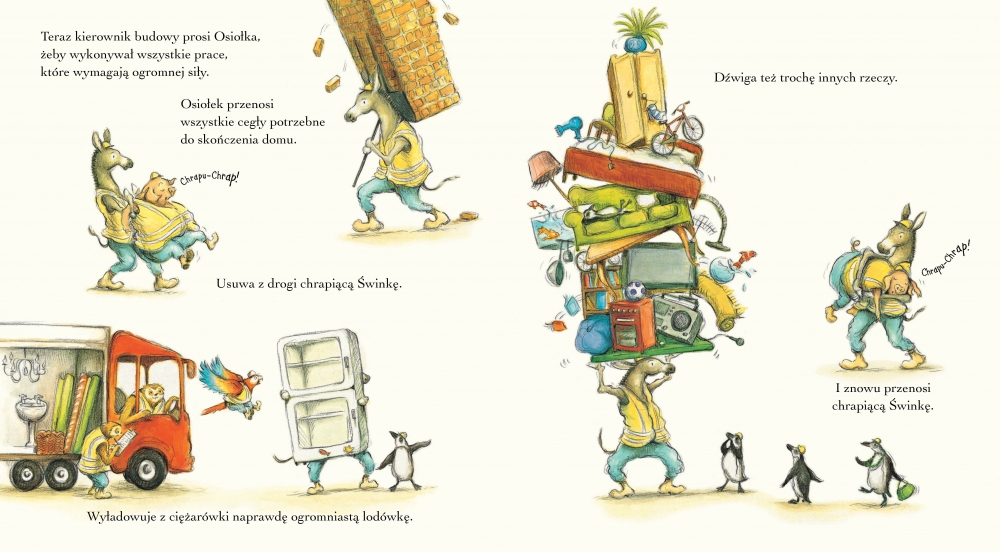 Czy Osiołek wykaże się jednak jakąś szczególną umiejętnością? Czy przekona się, w czym jest najlepszy? Czy znajdzie swoją siłę i z odwagą, pełen zapału pomoże doprowadzić do zakończenia budowy domu marzeń dla bardzo wymagających Pingwinów?