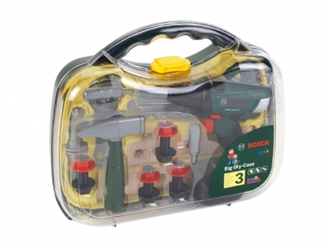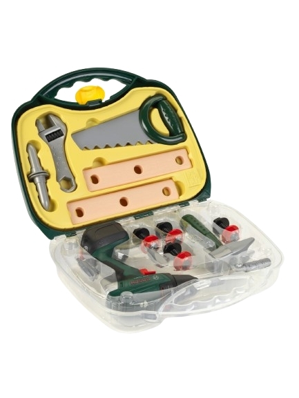 Walizka posiada żółty klips, który ją zamyka, zabezpieczając tym samym narzędzia tego kompletu przed przypadkowym wypadnięciem podczas transportu. W walizce znajdują się narzędzia i akcesoria do zabawy, a głównym narzędziem jest wiertarko-wkrętarka Bosch na baterie (KL 8567). Wiertarko-wkrętarka ma regulowane obroty w prawą i lewą stronę, włączane czerwonym przyciskiem, z boku zabawki, jak również dwie prędkości pracy, regulowane czerwonym przełącznikiem na czole urządzenia. Dodatkowo zabawka ma w komplecie cztery srebrne wymienne bity (wiertła), a także w w podstawie urządzenia białą diodę oświetlającą miejsce pracy. Zabawka jak prawdziwa ma wygodny uchwyt z gumową powierzchnią ułatwiającą utrzymanie zabawki w dziecięcych dłoniach. Wiertarko-wkrętarka podczas swojej pracy wydaje realistyczne dźwięki imitujące odgłosy pracy prawdziwego urządzenia. Ponadto w zestawie znajduje się piła ręczna, młotek, klucz francuski, dwie plastikowe deseczki z otworami do wkręcania śrub, a także 4 śruby z nakrętkami i 2 plastikowe gwoździe. Wszystkie elementy zestawu są wykonane z plastiku, pozbawione ostrych krawędzi i całkowicie bezpieczne dla dziecka. Dzięki wysokiej jakości wykonania śruby wkręca i wykręca się z dużą łatwością. Bawiąc się wiertarko-wkrętarką czy pozostałymi narzędziami walizki dzieci już od najmłodszych lat w bezpieczny sposób będą mogły wcielić się w rolę majsterkowicza, zapewniając sobie realistyczne doświadczenie korzystania z wszystkich jego części. Zestaw umożliwia maluchom kreatywną zabawę i doskonalenie umiejętności manualnych.