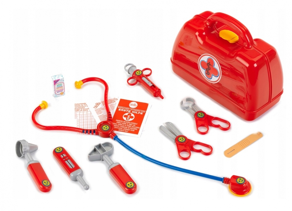 Zestaw w walizeczce o trapezowym kształcie zawiera podstawowe, niezbędne wyposażenie każdego medyka. Czerwona walizeczka wykonana jest z bardzo trwałego tworzywa, posiada wygodny uchwyt do noszenia oraz żółty klips, który zabezpiecza ją przed otwieraniem się. Ten zestaw zawiera aż 12 elementów. Wszystkie są oczywiście bezpieczne dla dzieci i proste w użyciu. W walizeczce znajdują się czerwono-granatowy plastikowy stetoskop, nożyczki plastikowe, szczypce, strzykawka, termometr, otoskop, młoteczek, plaster i notatnik. Wszystkie elementy są oczywiście bezpieczne dla dzieci i proste w użyciu. Seria zestawów i akcesoriów lekarskich z jednej strony służy zabawie w doktora czy pielęgniarkę, a z drugiej strony pomaga dzieciom oswoić się z tematem wizyty u lekarza, wykonywanych badań i zabiegów. Mamy tutaj szeroki wybór zestawów z większą lub mniejszą ilością akcesoriów oraz szereg pojedynczych produktów jak np. fartuchy lekarskie czy stetoskopy. Cała seria wizualnie stworzona jest tak, aby mogli się nią bawić zarówno chłopcy jak i dziewczynki.