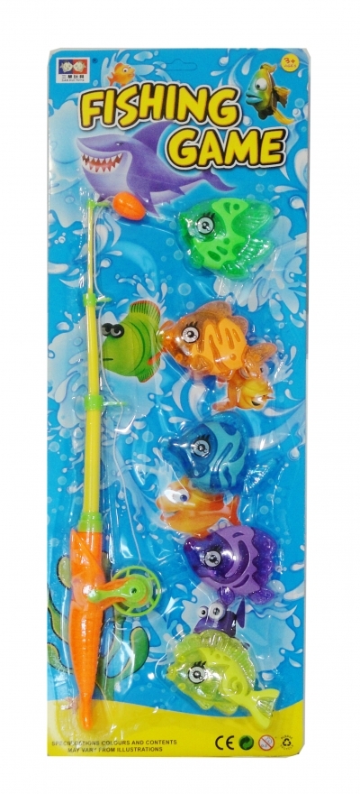 Kolorowa wędka dla małych wędkarzy. W zestawie oprócz wędki można znaleźć 5 kolorowych rybek w różnych kształtach. Całość zapakowana jest w kartonową podstawkę z przezroczystym kloszem. Zabawka dla dzieci powyżej 3 lat. Podane wymiary są wymiarami opakowania.