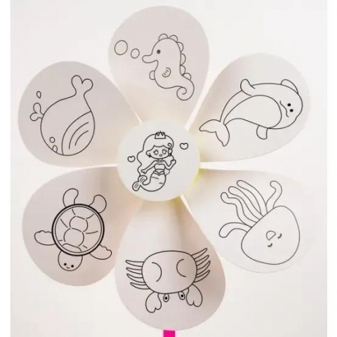 papierowy wiatraczek z szablonem do malowania, 6 końcówek, centralne koło, patyczek, całkowita długość złożonego wiatraczka 38,5 cm