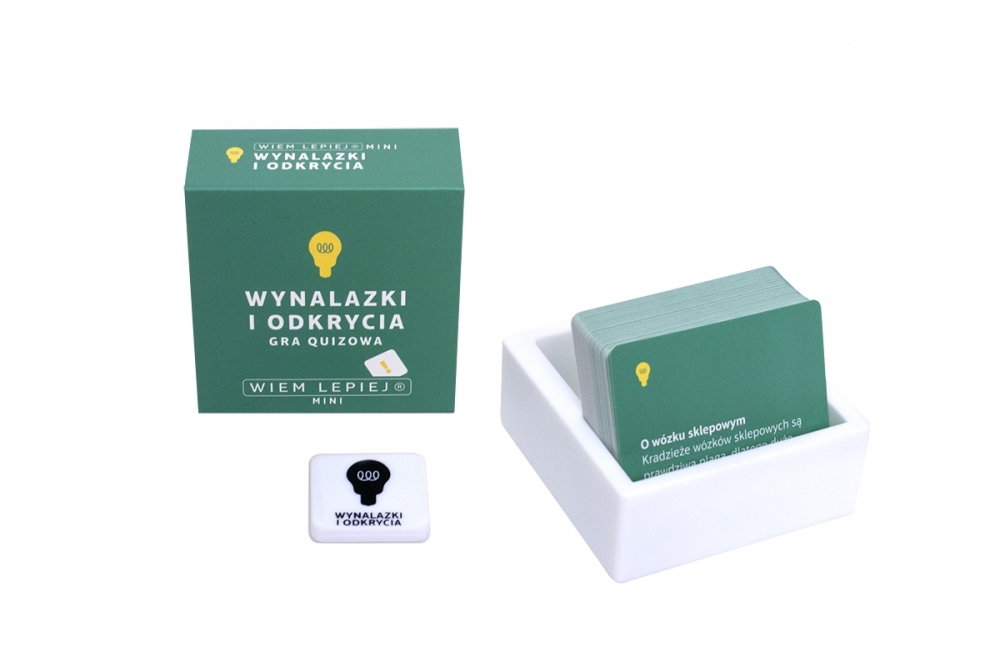 Wiem lepiej: Wynalazki i odkrycia to 60 pytań, które sprawdzą Waszą wiedzę o najważniejszych postaciach i zdobyczach świata nauki. Możecie odpowiadać na pytania tylko z tej kategorii, ale też wykorzystać zestaw jako dodatek do taktycznej gry quizowej Wiem lepiej. W pudełku znajdziesz płytkę kategorii, którą możesz dołączyć do puli podstawowych lub zastąpić nią jedną z nich.