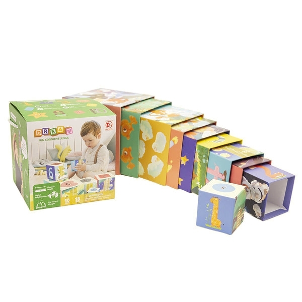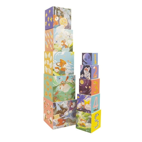 Wieża składa się z 10 kartonowych sześcianów, które należy ułożyć od największego do najmniejszego.