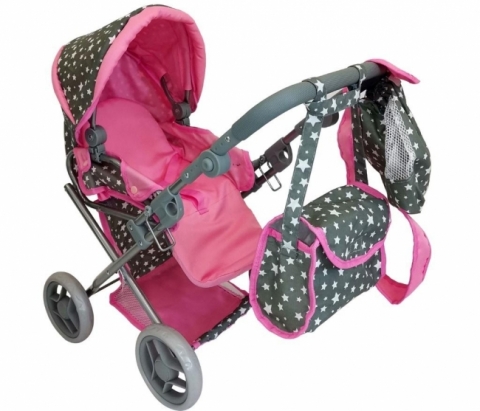 Wózek posiada: ładne metalowe rurki, szybkie składanie, blokadę przed samoczynnym złożeniem się wózka, materiał solidny bawełniany z możliwością zdjęcia do prania, duży kosz na zakupy, wyjmowane nosidło, pościel, regulowaną wysokość rączki, torbę, pasy w wersji spacerowej.