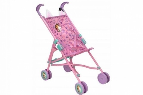 Wózek parasolka inspirowany uwielbianym przez dzieci serialem "Koci Domek Gabi" to idealny wybór dla małych miłośników zabawy w opiekę nad lalkami i pluszakami. Wózek utrzymany jest w pastelowych odcieniach różu i fioletu, ma słodkie kocie uszka, a na jego siedzisku znajduje się urocza grafika przedstawiająca Gabi i jej przyjaciela Pandusia.