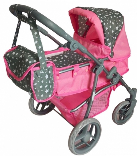 Wielofunkcyjny wózek dla lalek głęboki i spacerowy. Zalety wózka: lekki, stabilny, kółka piankowe, wykonany z rurek aluminiowych, regulowana rączka, blokada przed samoczynnym złożeniem się wózka, materiał na zatrzaskach z możliwością zdjęcia i wyprania, w wersji spacerowej pasy bezpieczeństwa, kosz, torebka, plecak dla dziewczynki, proste składanie wózka.