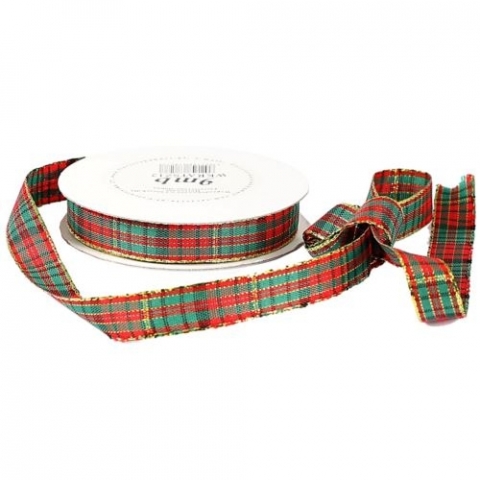Wstążka materiałowa w szkocką kratkę, złocona, o szerokości 12mm i długości 9mb.Jest to wstążka, którą z powodzeniem można wykorzystać przy ozdabianiu art. styropianowych, dekoracjach ślubnych i wielu innych.