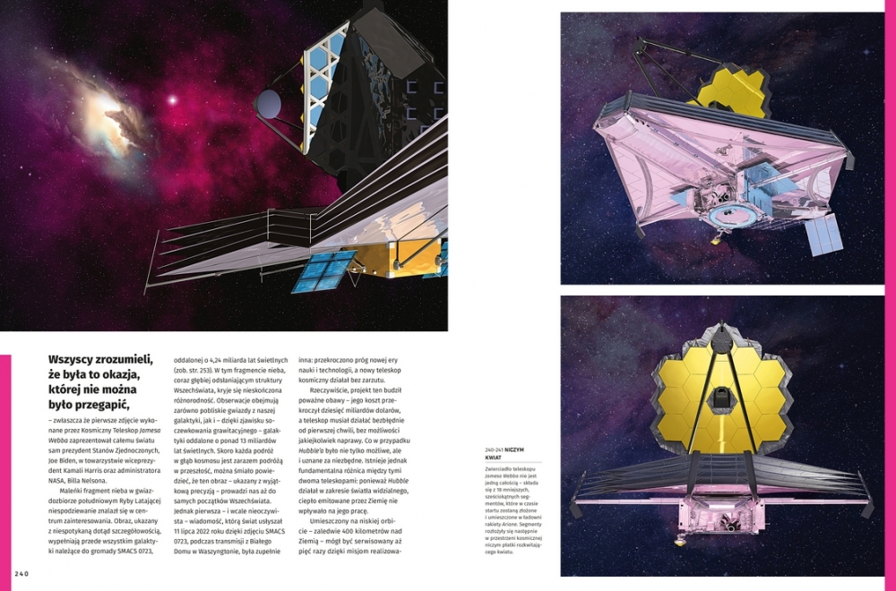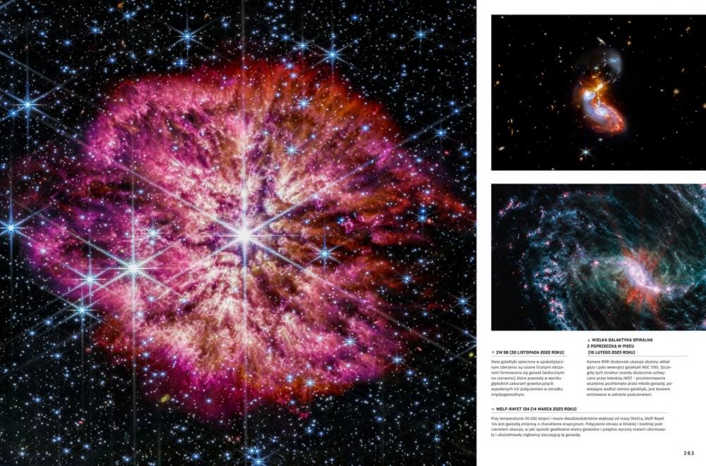 Na stronach tej imponującej publikacji znajdziemy spektakularne i zarazem oszałamiająco piękne zdjęcia Wszechświata (a także kody QR odsyłające do materiałów multimedialnych) wykonane przez Kosmiczny Teleskop Jamesa Webba (JWST).