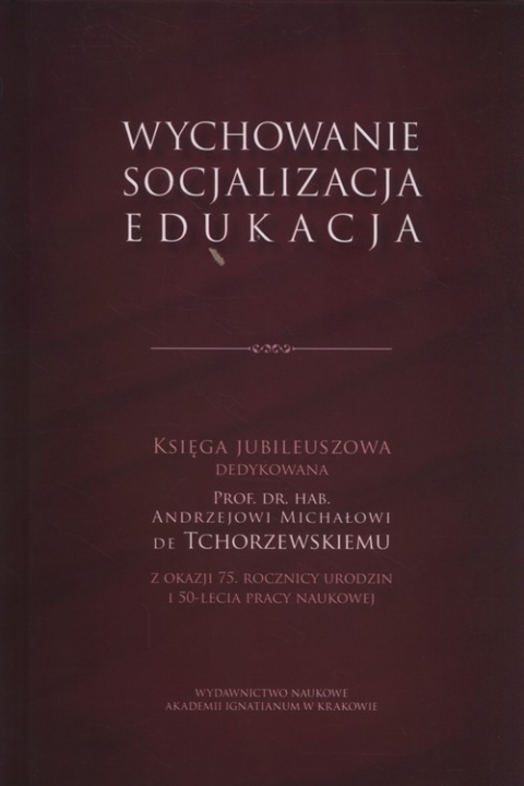 Niniejsza Księga Jubileuszowa jest dedykowana Panu Profesorowi zw. dr hab. Andrzejowi Michałowi Tomaszowi de Tchorzewskiemu w 75. rocznicę Jego urodzin i 50-lecie pracy naukowo-dydaktycznej i organizacyjnej. Praca ta zaowocowała licznymi, odpowiedzialnymi funkcjami, między innymi prorektora ds. dydaktycznych (1987-1990) i rektora (1990-1993; 1993-1996; 1999-2002) Wyższej Szkoły Pedagogicznej/Akademii Pedagogicznej im. Kazimierza Wielkiego w Bydgoszczy.Tytuł tomu jubileuszowego Wychowanie – Socjalizacja – Edukacja oddaje kierunki i obszary badań Profesora. Jego liczne prace, poszukujące na gruncie pedagogiki tożsamości polskiej teorii wychowania, nowych orientacji metodologicznych i reperkusji praktycznych osadzonych w kontekstach historycznych i filozoficznych, stanowią ważny wkład w polską myśl pedagogiczną. Cenione i uważane wręcz za prekursorskie są badania z zakresu pedagogiki rodziny, ze szczególnym uwzględnieniem jej funkcji edukacyjnych, kondycji wychowawczej oraz transformacji w okresie przemian. Oprócz nich równie istotne są badania i publikacje Profesora na temat aksjologii pedagogicznej oraz problematyki etyczno-deontologicznej zawodu nauczycielskiego. Z nią wiązał Jubilat swoje badania empiryczne i rozważania teoretyczne dotyczące procesów kształcenia i formacji osobowościowej, w tym świadomości kandydatów na nauczycieli. Prezentowany zbiór studiów został podzielony na sześć części. Część pierwsza zawiera teksty okolicznościowe z wątkami biograficznymi, bibliografię autorską oraz wykaz doktoratów wypromowanych przez Profesora. Ten dział Księgi zamyka Tabula Gratulatoria. Kolejne działy Księgi Jubileuszowej zatytułowane są następująco: II. Trójjednia: filozofia – nauka – pedagogika; III. Wartości i poszukiwania współczesnych teorii wychowania; IV. Meandry wychowania; V. Rodzina w kontekście przemian globalizującego się świata; VI. Osoba i zawód nauczyciela.