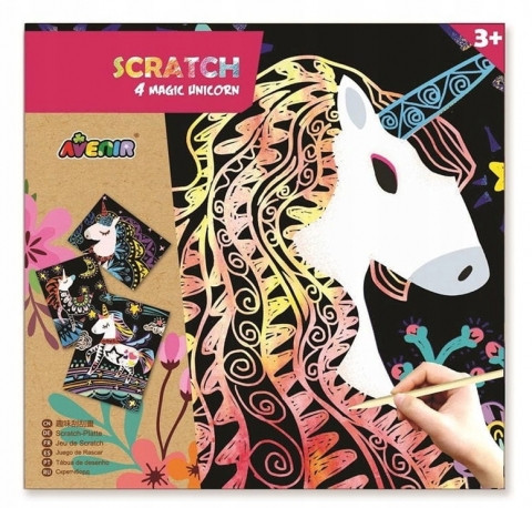 Wyjątkowy arkusz, na którym tworzy się poprzez zdrapywanie warstwy wierzchniej, by odsłonić wielobarwną warstwę spodnią. W zestawie są 4 magiczne jednorożce oraz patyczek do zdrapywania.