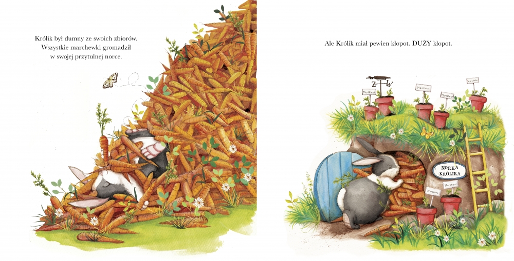 Kocha je tak bardzo, że w jego przytulnej norce zaczyna brakować miejsca dla niego. Przyjaciele proponują mu pomoc, Królik przyjmuje ją z radością. Ale czy mnóstwo marchewek nie oznacza mnóstwa kłopotów dla Królika i jego przyjaciół?