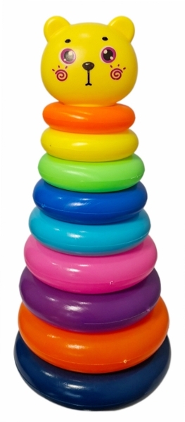 Kolorowa piramidka składająca się z podstawy, trzonka oraz kilku krążków w różnych kolorach i rozmiarach. Na szczycie znajduje się główka misia, która stanowi zakończenie zabawki. Elementy można nakładać jeden na drugi, tworząc wysoką piramidę. Produkt dla dzieci od 24 miesiąca życia. Prodkt zapakowany w worek z siateczki.