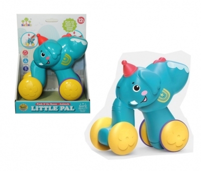 - Działa na zasadzie naciśnięcia elementu, który po zwolnieniu napędza zabawkę do przodu, zachęcając malucha do raczkowania, biegania lub podążania za nią.